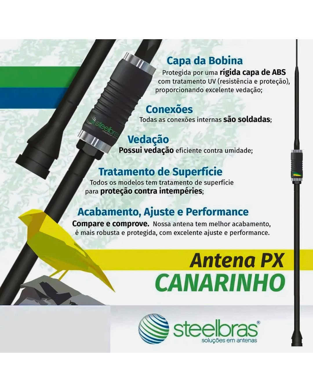 A AP3003 – Antena Móvel PX Bobina no Centro CANARINHO com Prolongador PRETA é uma antena com bobina de alta eficiência na centro, projetada para operar na faixa do cidadão (27 MHz – 11 Metros). Construída em aço inoxidável, latão cromado, núcleo da bobina em nylon e fio de cobre esmaltado de alta performance. Possui o mesmo padrão de fixação utilizado na ̈MARIA MOLE ̈ tradicional, utilizando ainda o mesmo sistema de trava anti-furto na base (Patenteado).